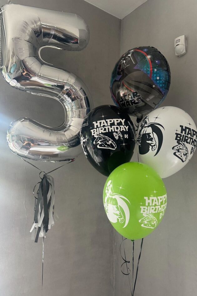 Set incluye: Un número de 1 metro con helio, un foil de Dark Vather o Baby Yoda, acompañado con 3 globos látex estampados de StarWars.